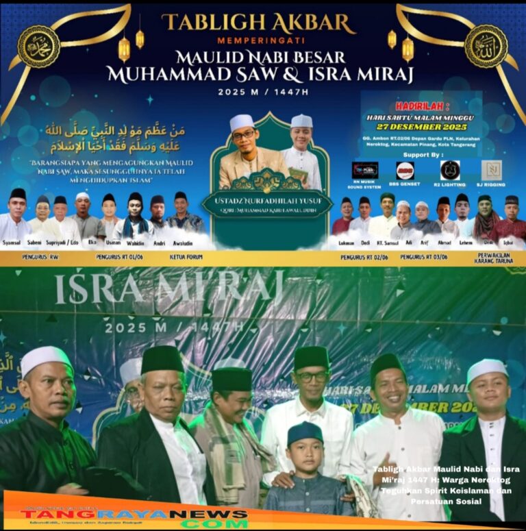 TANGERANG KOTA, BERITAMETROPOLITAN.ID – Antusiasme warga Gang Ambon RT 002 RW 06, Kelurahan Neroktog, Kecamatan Pinang, Kota Tangerang, terlihat begitu tinggi dalam acara peringatan Maulid Nabi Besar Muhammad SAW dan Isra Mi’raj 1447 Hijriah/2025 Masehi. Kegiatan keagamaan tersebut berlangsung khidmat dan penuh kebersamaan.