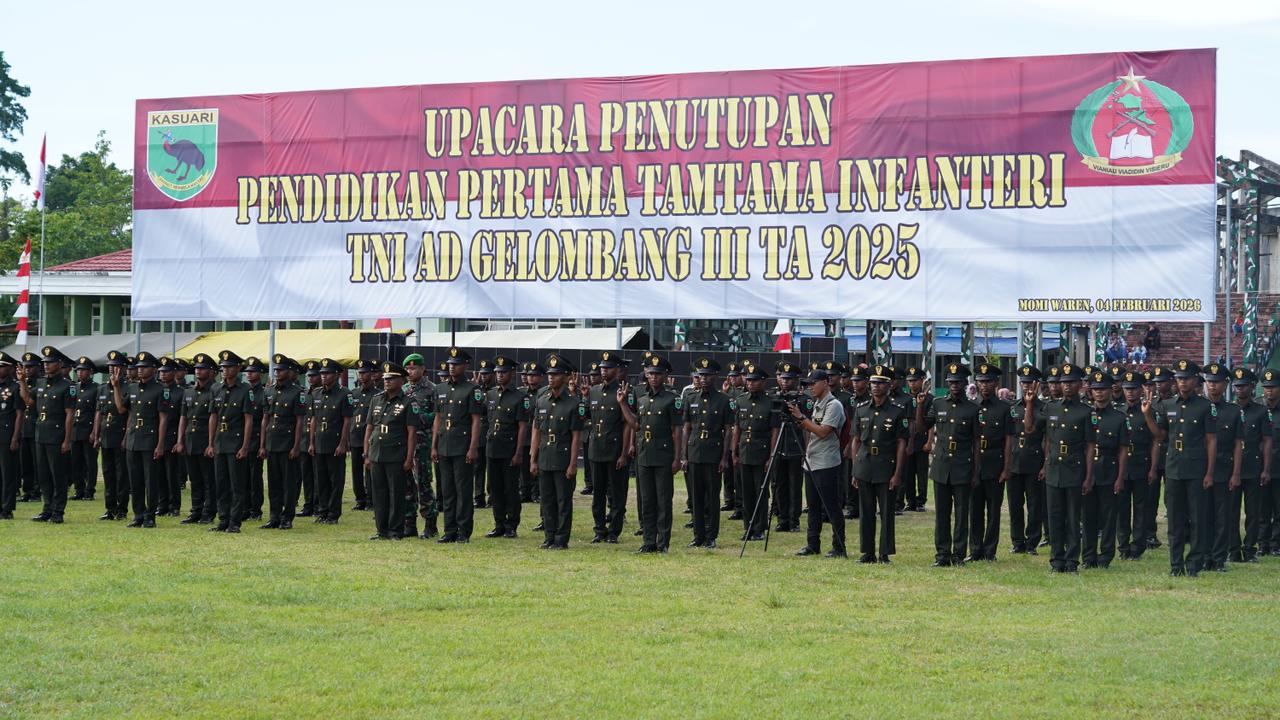MOMIWAREN, Beritametropolitan.id – Prajurit Tamtama TNI AD yang disiapkan dalam Batalyon Teritorial Pembangunan (Yon TP) dibina sebagai kekuatan utama dengan kemampuan teritorial, fisik, dan mental yang tangguh. Hal tersebut disampaikan melalui amanat tertulis Kasad yang dibacakan oleh Irdam XVIII/Kasuari Brigjen TNI Tri Saktiyono pada upacara penutupan Pendidikan Pertama Tamtama TNI AD Gelombang III TA 2025 di Rindam XVIII/Kasuari, Momiwaren, Manokwari Selatan, Rabu (4/2/2026).